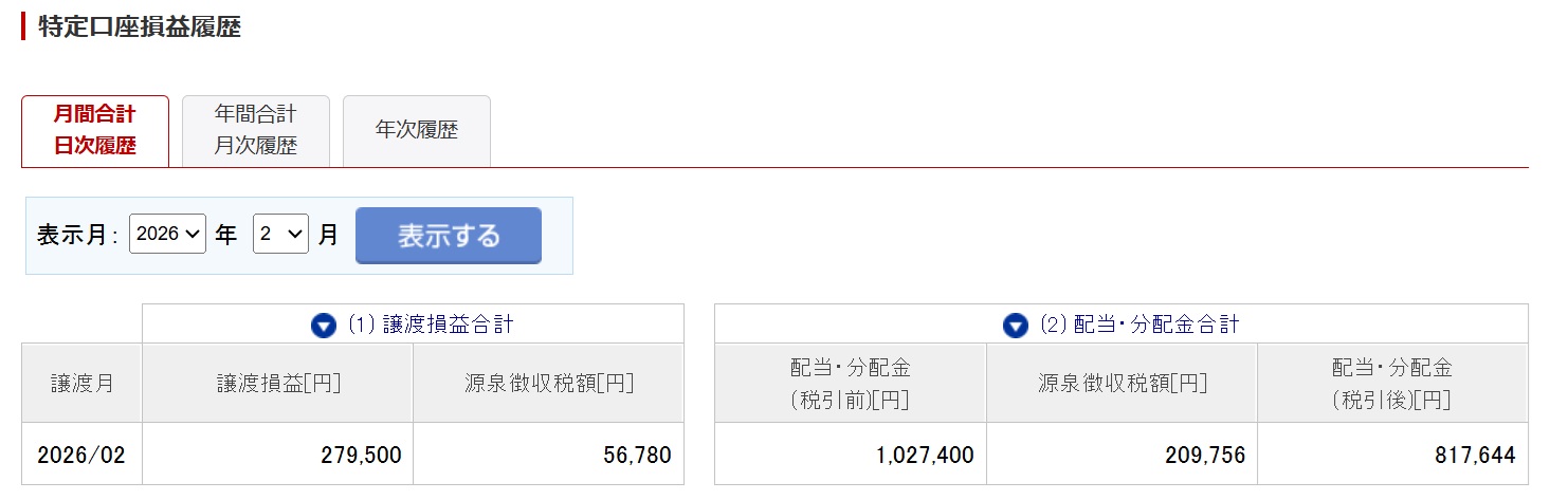 譲渡損益 279,500円配当・分配金 1,027,400円 ※別途 新ニーサ 0円
