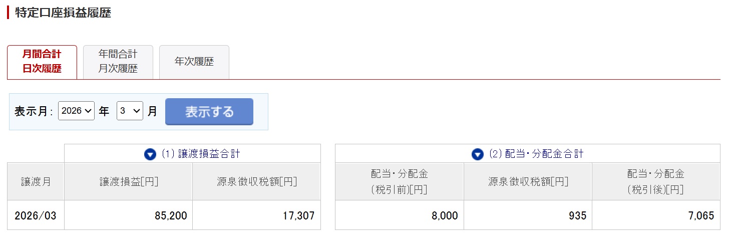 譲渡損益 85,200円配当・分配金 8,000円 ※別途 新ニーサ 72,084円